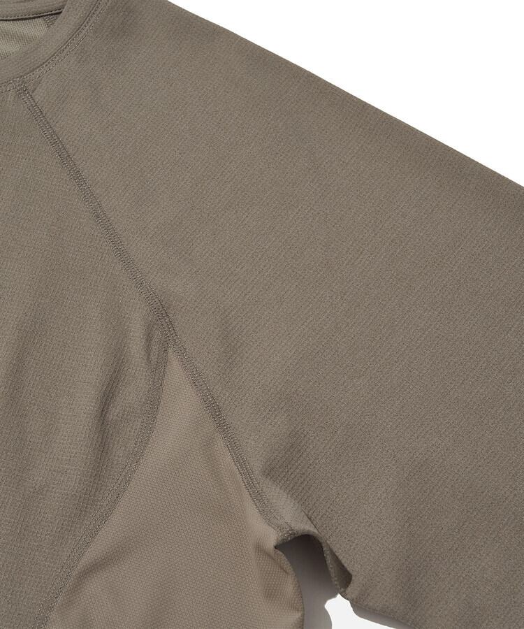 吸汗速乾素材を使用し、汗を素早く吸収・乾燥させることで、暖かい環境でも快適な着心地をキープ。発汗しやすい部位にはメッシュ素材を配置し、通気性を高めています。