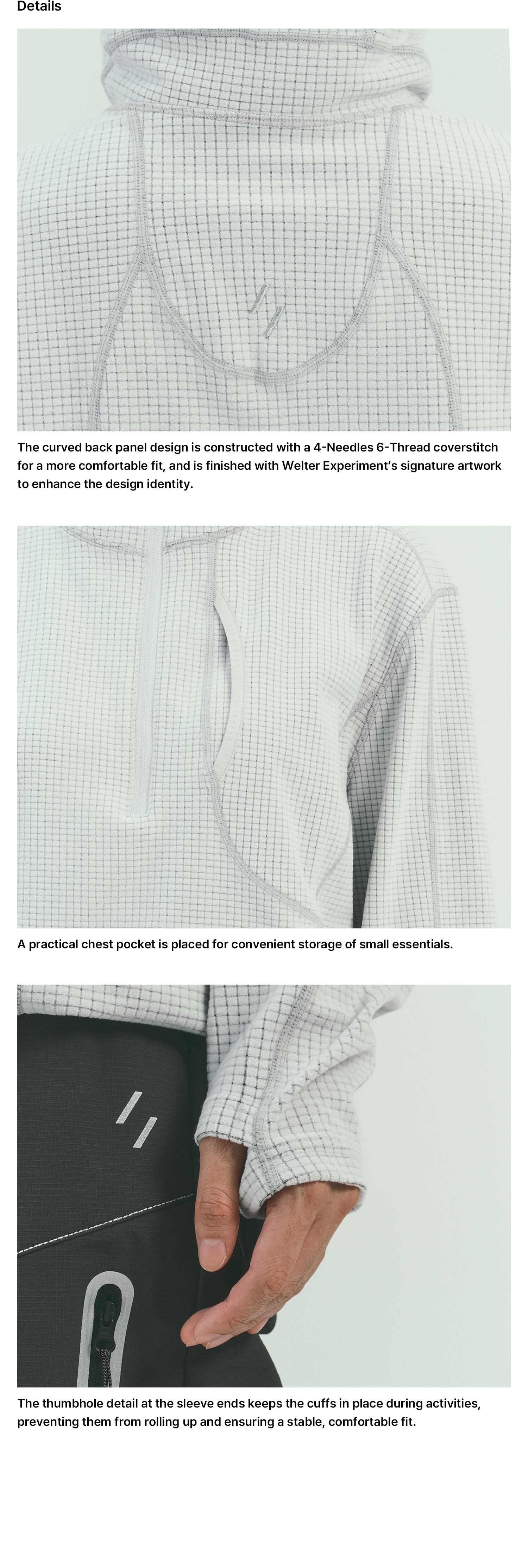 Welter Experimentが独自開発したグリッド構造のフリース素材を採用。内部の空気層が保温性を保ちながら、熱や湿気を効率よく放出し、軽量で快適な着心地をキープします。吸湿・速乾性にも優れ、アウトドアから日常まで幅広いシーンに対応。